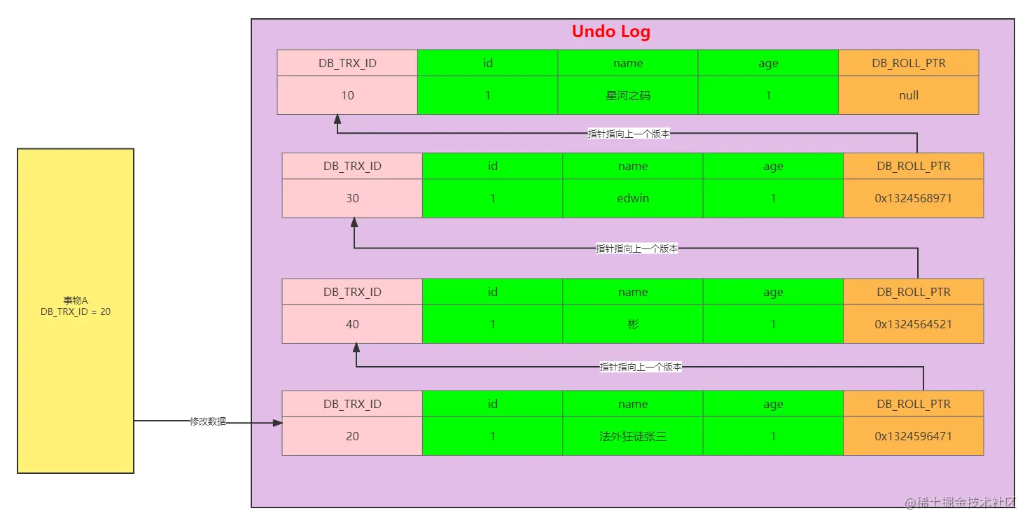 #事物A: update user set name = '法外狂徒张三' where id = 1;此时事务A还没有提交,但是已经写入了Undo 日志,新的版本链如下