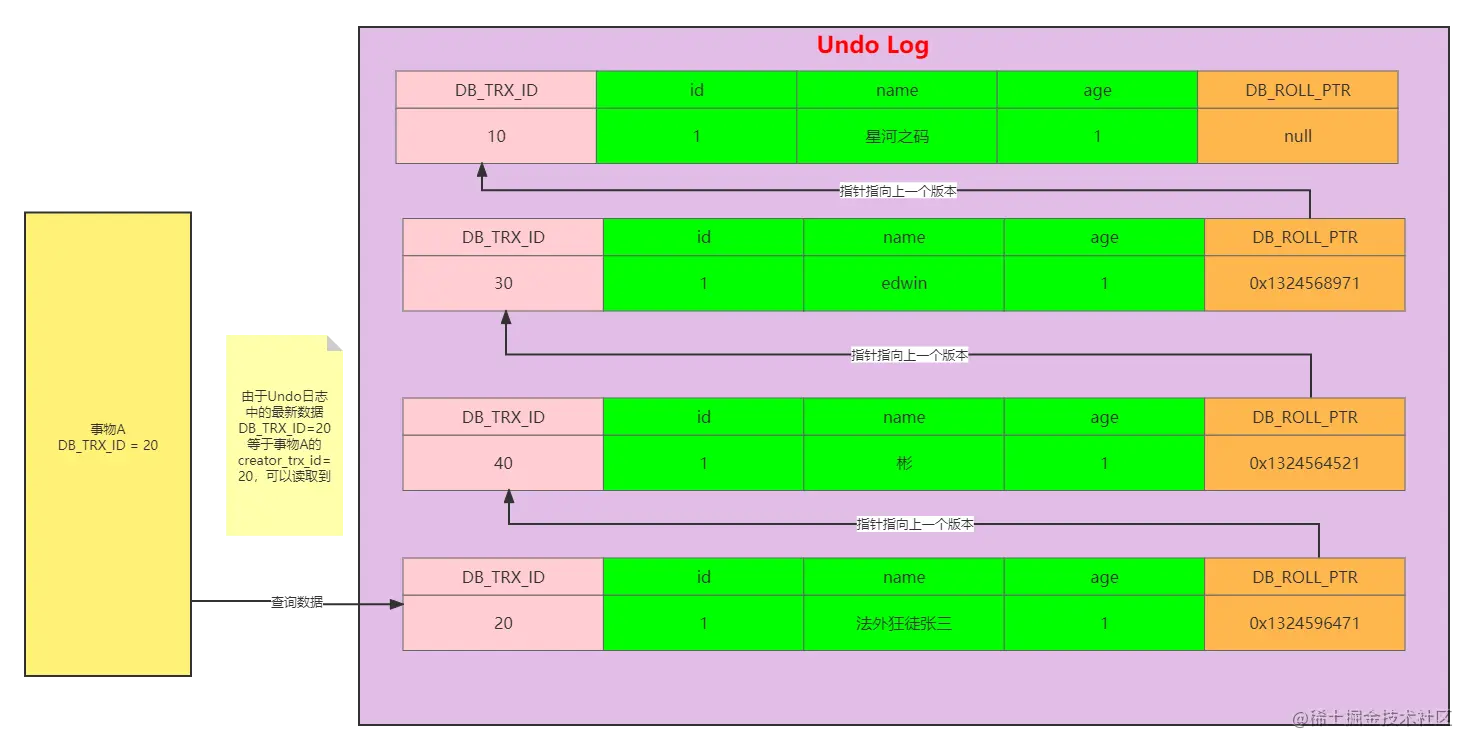 由于Undo日志中的最新数据DB_TRX_ID=20等于事物A的creator_trx_id=20,说明是自己修改的数据,可以查到,name=法外狂徒张三