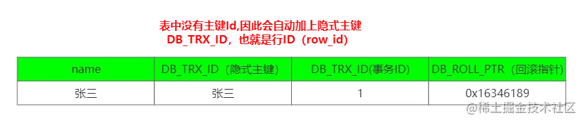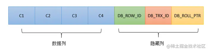 在InnoDB存储引擎,针对每行记录都有固定的两个隐藏列【DB_TRX_ID】【DB_ROLL_PTR】以及一个可能存在的隐藏列【DB_ROW_ID】。