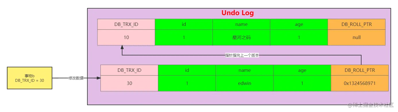 - 【第三步】:事务 B 【DB_TRX_ID = 30】修改数据,将name修改为Edwin,修改后写入Undo Log日志,此时还没有提交事务B。示意图如下: