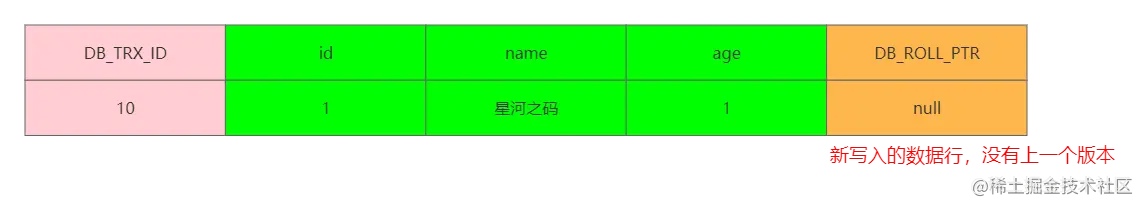 假设有一个事物【DB_TRX_ID = 10】在表中插入了一条数据,则它的数据结构为为: