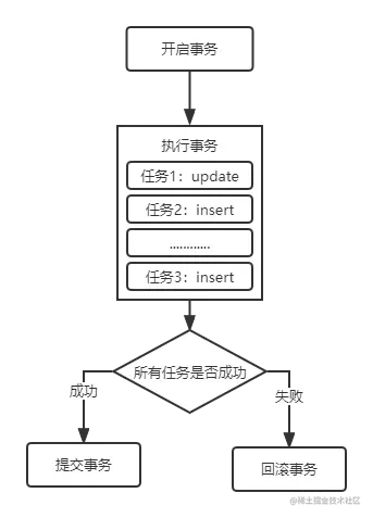 事务就是当要完成一件事件,这件事又包含多个任务的时候,只有当所有的任务都执行成功,则认为这个事情是成功;只要有其中一个任务没有执行成功,则认为这件事执行失败,其他的执行成功的任务也要回滚到未执行的状态。