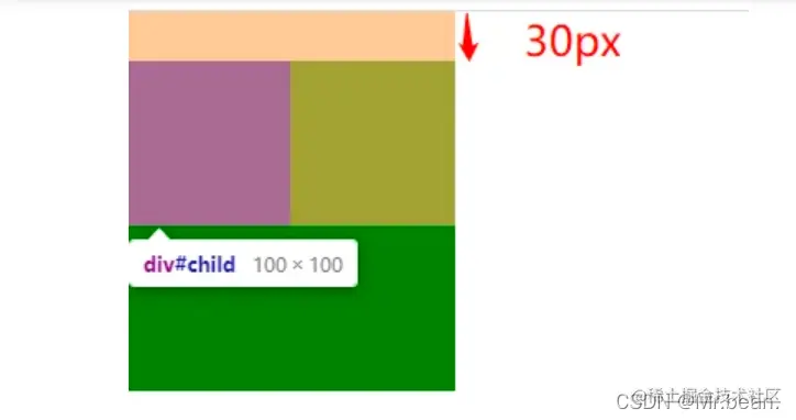 margin-top 为 30px,但我们发现红色 div 的顶部与绿色 div 顶部重合,并没有距离顶部 30px,而是溢出到父元素的外面计算。即本来父元素距离顶部只有 20px,被子元素溢出影响,外边距重叠,取较大的值,则距离顶部 30px。