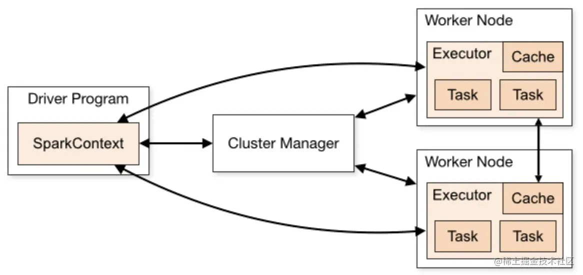一个完整的Spark应用程序,在提交集群运行时,它涉及到如下图所示的组件: