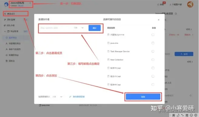 在个人管理中心,点击【邀请成员】即可邀请成员进入团队中,同时可以根据需求选择进入不同项目中。