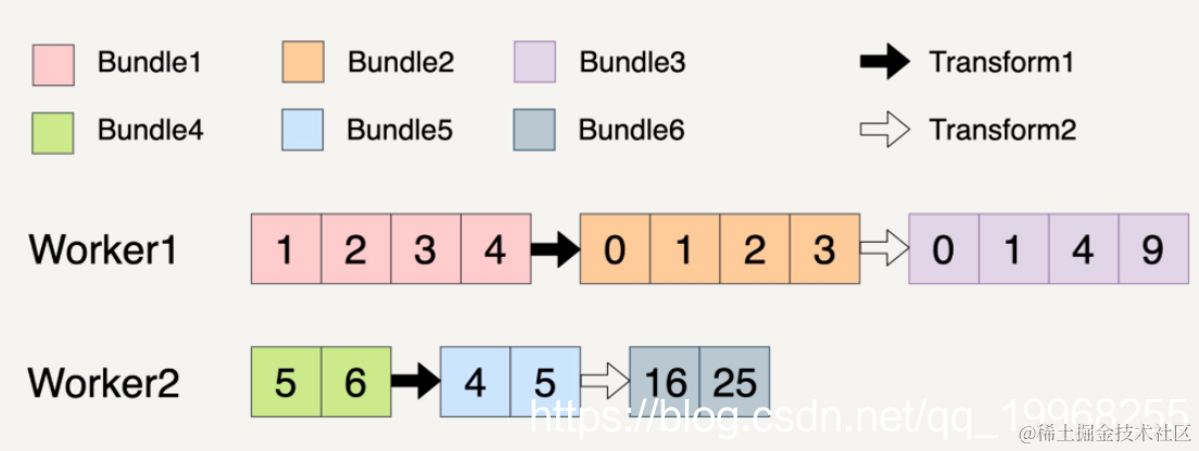 Beam数据流水线的底层思想其实还是mr得原理,在分布式环境下,整个数据流水线启动N个Workers来同时处理PCollection.而在具体处理某一个特定Transform的时候,数据流水线会将这个Transform的输入数据集PCollection里面元素分割成不同Bundle,将这些Bundle分发给不同Worker处理。