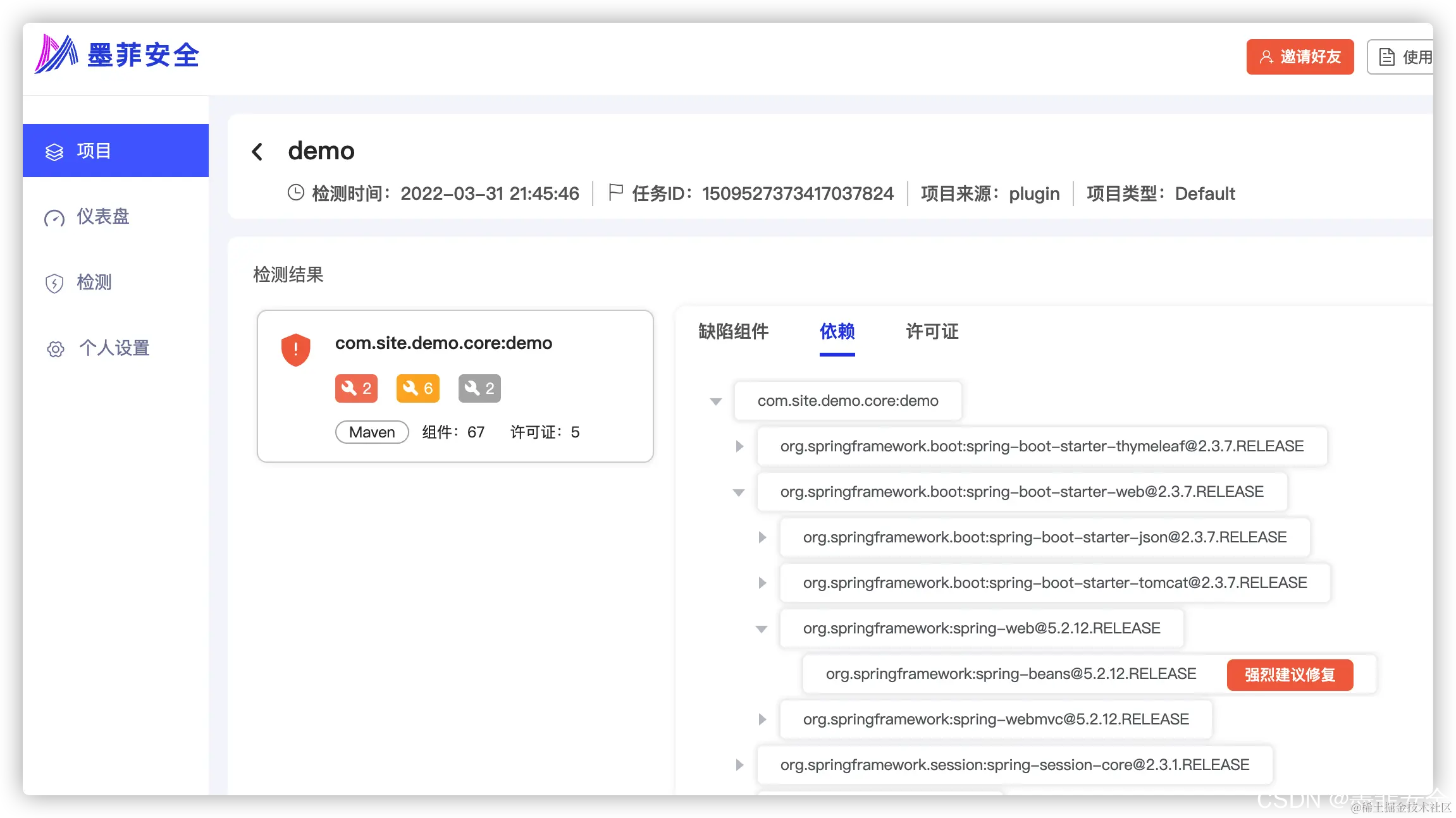 以上几种检测方式均可在墨菲安全平台上查看详细的检测结果,并可以查看项目的直接或间接依赖信息。