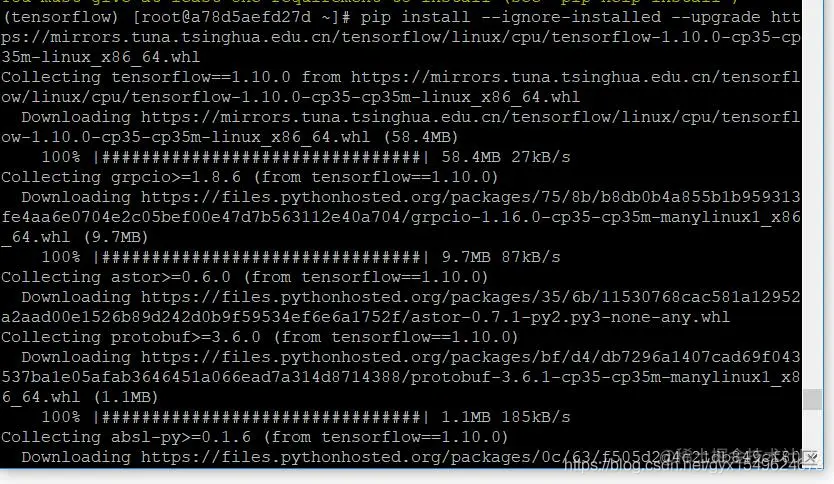 然后通过pip命令安装tensorflow,仍然使用了清华镜像tensorflow | 镜像站使用帮助 | 清华大学开源软件镜像站 | Tsinghua Open Source Mirror