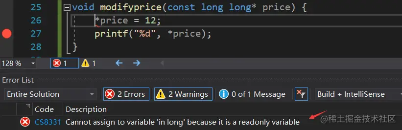 可以看到,这时候报错了,如果换成 C++ 就很简单了,只需要在参数上把 in 改成 const 即可。