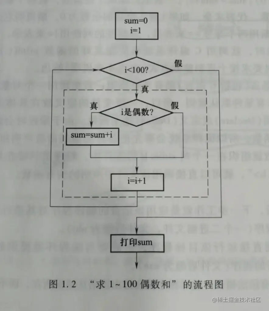 对于 1.4 节中的流程图 1.2,是求 1-100 偶数和。流程图如下: