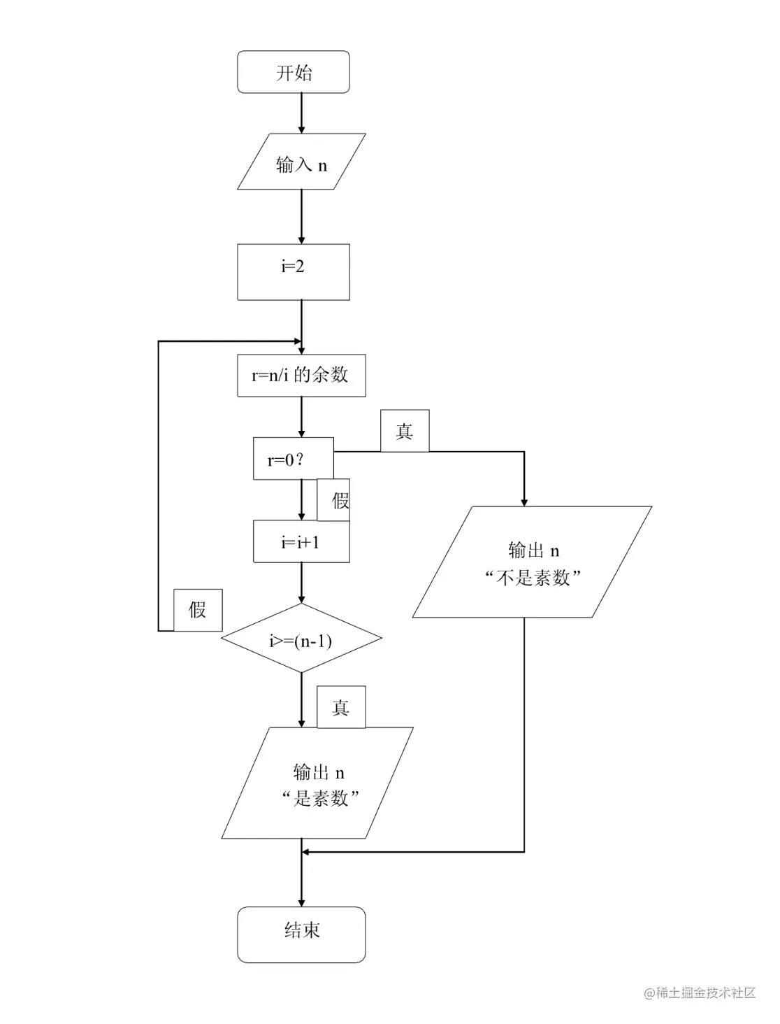 解析: 素数就是只能被 1 和自己整除的数。那我们让 n 从 2 开始除,一直除到 n-1,如果在这期间,n 可以被整除,那么就说明 n 不是素数,如果一次都没有被整除过,那么 n 就是素数。