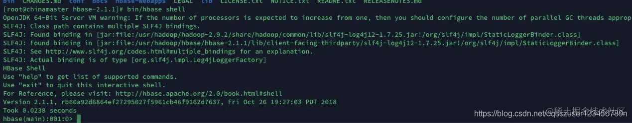 进入到hbase的安装目录下,使用bin/hbase shell启动hbase:
