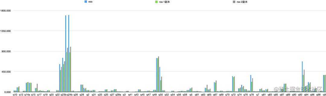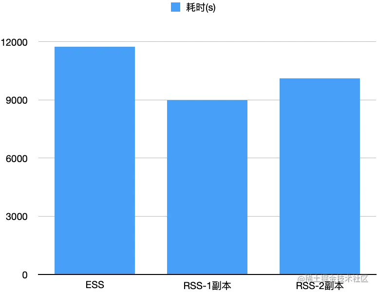 我们测试了10T的TPCDS,E2E来看,ESS耗时11734s,RSS单副本/两副本分别耗时8971s/10110s,分别比ESS快了23.5%/13.8%,如下图所示。我们观察到RSS开启两副本时网络带宽达到上限,这也是两副本比单副本低的主要因素。