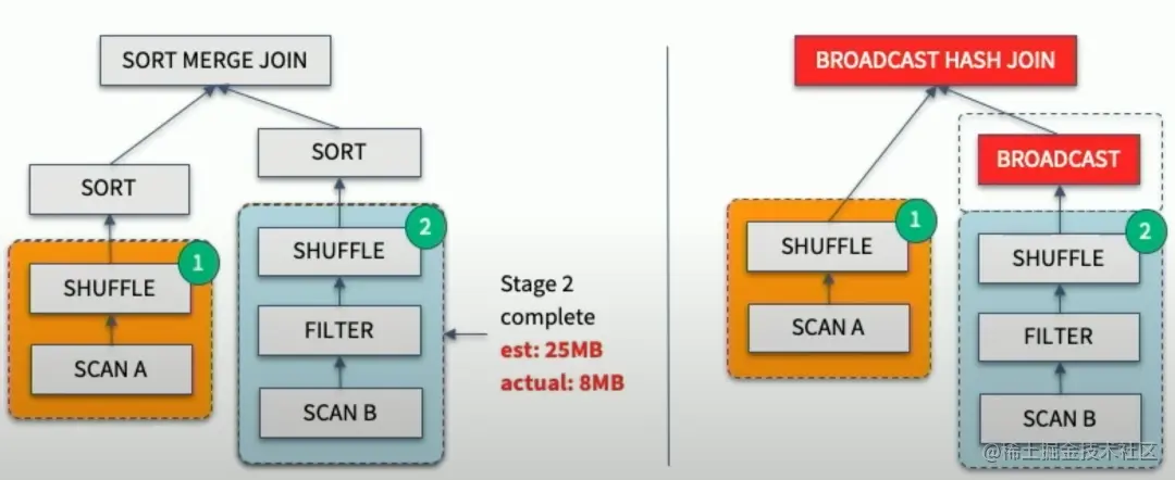 Join策略切换的目的是修正由于Stats预估不准导致Optimizer把本应做的Broadcast Join错误的选择了SortMerge Join或ShuffleHash Join。具体而言,在Join的两张表做完Shuffle Write之后,AQE框架统计了实际大小,若发现小表符合Broadcast Join的条件,则将小表Broadcast出去,跟大表的本地Shuffle数据做Join。流程如下: