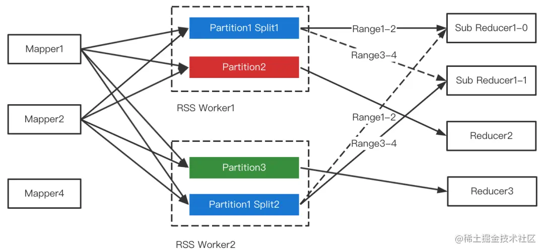 RSS的核心设计是Push Shuffle + Partition数据聚合,即不同的Mapper把属于同一个Partition的数据推给同一个Worker做聚合,Reducer直读聚合后的文件。如下图所示。