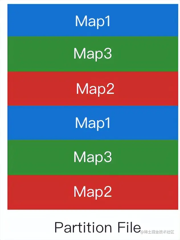 在AQE的三个场景中,RSS支持Join倾斜优化是最为困难的一点。RSS的核心设计是Partition数据聚合,目的是把Shuffle Read的随机读转变为顺序读,从而提升性能和稳定性。多个Mapper同时推送给RSS Worker,RSS在内存聚合后刷盘,因此Partition文件中来自不同Mapper的数据是无序的,如下图所示。