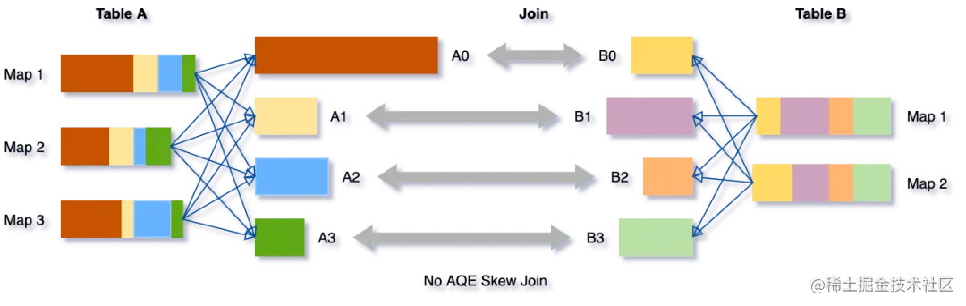 倾斜Join优化的目的是让倾斜的Partition由更多的Reducer去处理,从而避免长尾。具体而言,在Shuffle Write结束之后,AQE框架统计每个Partition的Size,接着根据特定规则判断是否存在倾斜,若存在,则把该Partition分裂成多个Split,每个Split跟另外一张表的对应Partition做Join。如下所示。