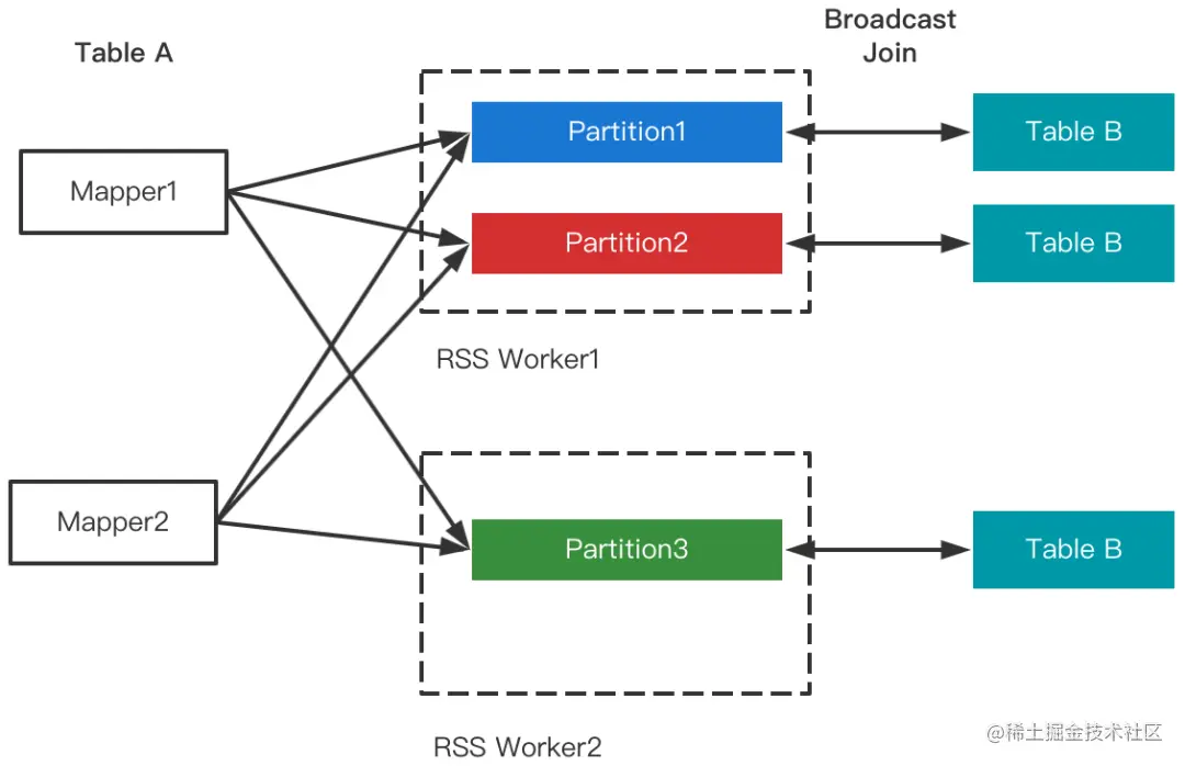 Join策略切换对Shuffle框架的需求是能够支持LocalShuffleReader。由于RSS的Remote属性,数据存放在RSS集群,仅当RSS和计算集群混部的场景下才会存在在本地,因此暂不支持Local Read(将来会优化混部场景并加以支持)。需要注意的是,尽管不支持Local Read,但并不影响Join的改写,RSS支持Join改写优化如下图所示。