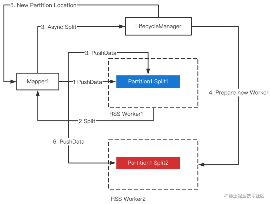 Split发生时,RSS会为当前Partition重新分配一对Worker(主副本),后续数据将推给新的Worker。为了避免Split对正在运行的Mapper产生影响,我们提出了Soft Split的方法,即当触发Split时,RSS异步去准备新的Worker,Ready之后去热更新Mapper的PartitionLocation信息,因此不会对Mapper的PushData产生任何干扰。整体流程如下图所示。