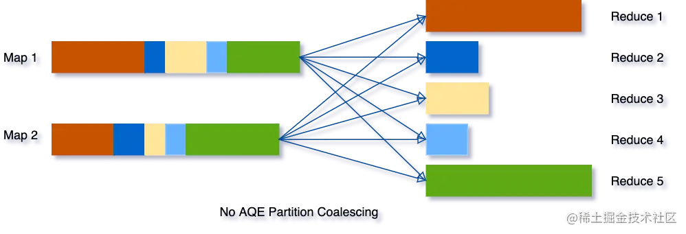 Partition合并的目的是尽量让reducer处理的数据量适中且均匀,做法是首先Mapper按较多的Partition数目进行Shuffle Write,AQE框架统计每个Partition的Size,若连续多个Partition的数据量都比较小,则将这些Partition合并成一个,交由一个Reducer去处理。过程如下所示。