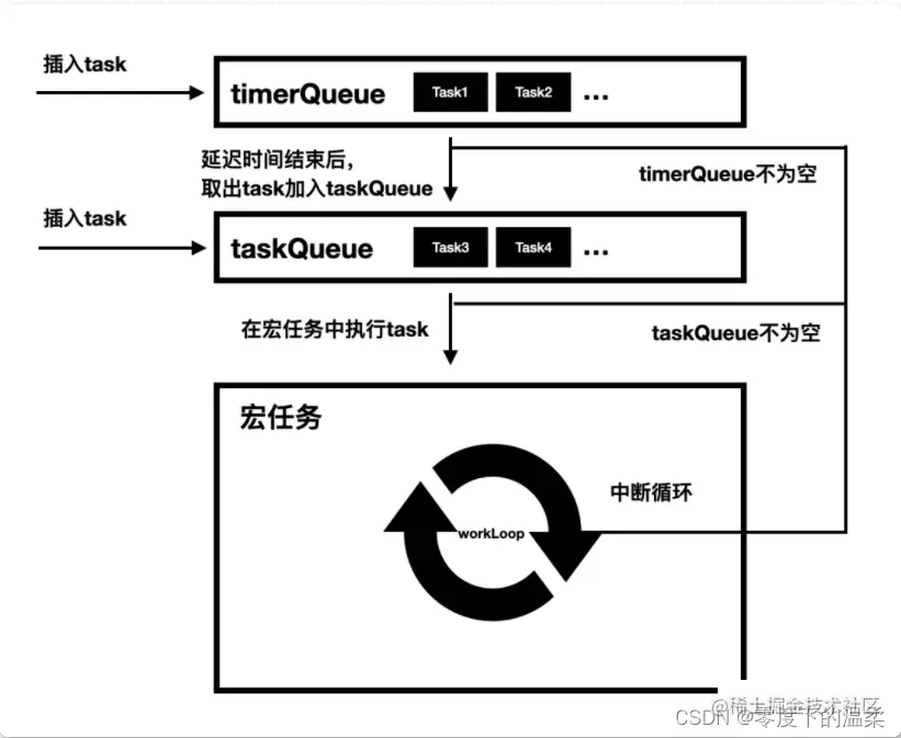 2.循环中断后,如果taskQueue不为空,则进入步骤3。如果timerQueue不为空,则进入步骤2