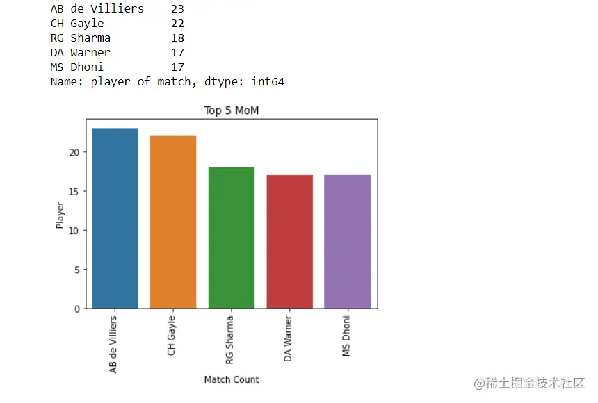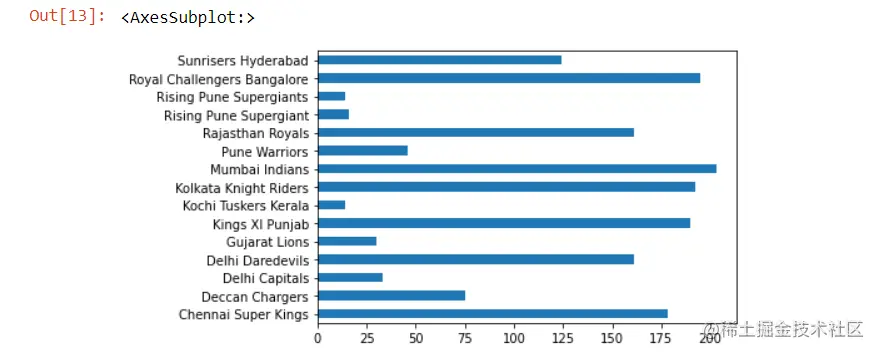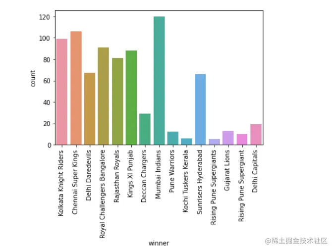 当你运行这个单元时,你会看到孟买印度人赢得了最多的比赛,其次是CSK和其他球队。现在,如果你想把这个结果以图表的形式绘制出来,那么在下一个单元格运行这个程序。