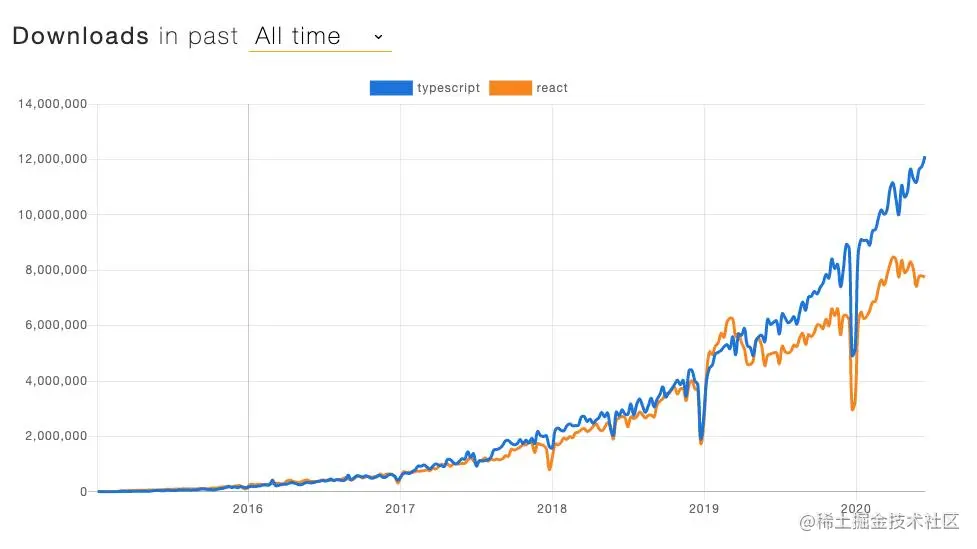 TypeScript下载量在最近两年左右上涨超500%,上升速度犹如坐上火箭。而且跟react的上升趋势有很大相像之处(或许是因为微软的大力推广,大量react开发者都选择使用TypeScript开发):