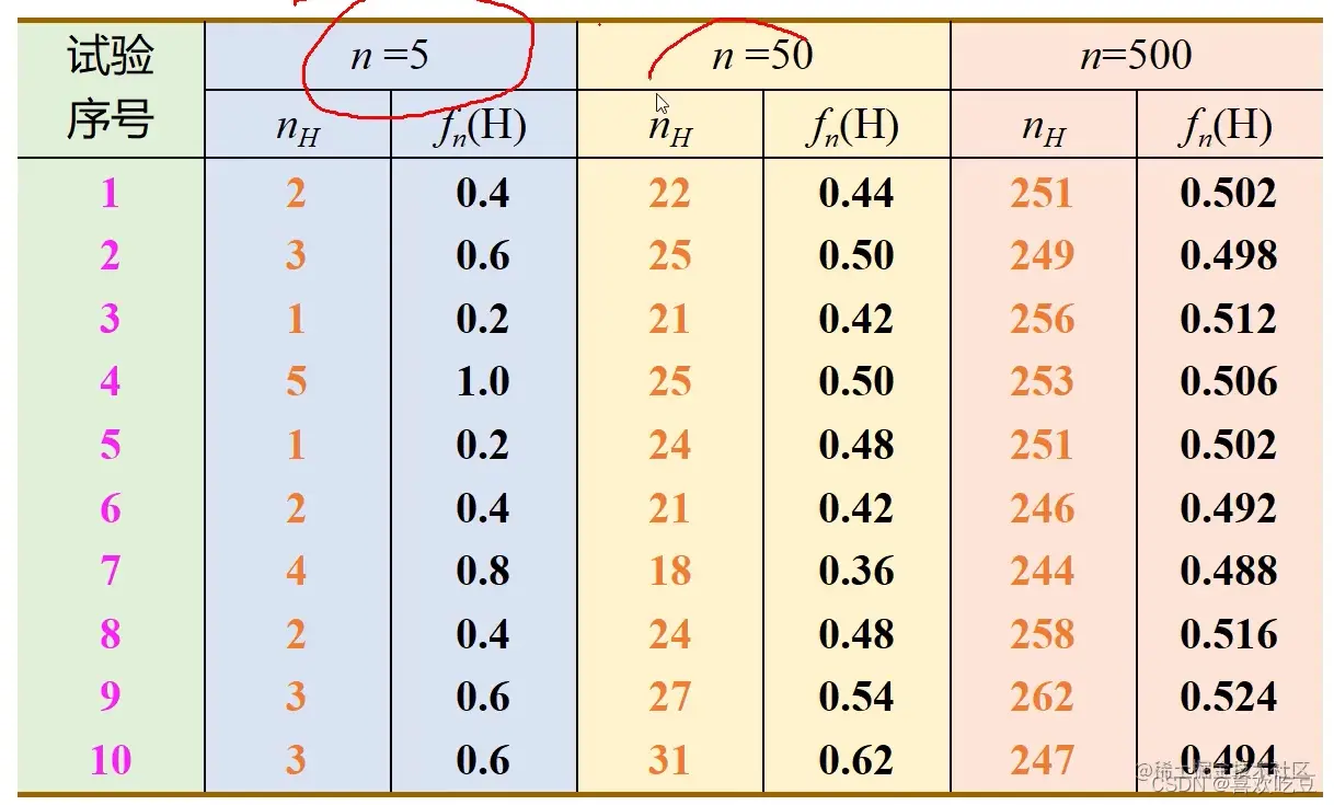 在试验不变的条件下,重复实验多次,随机事件的频率近似于它的概率。