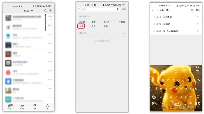 第1步:启动手机微信后,点击搜索功能,将搜索结果的类型选择为是音乐,随后输入想要加入状态的音乐歌曲即可搜索;