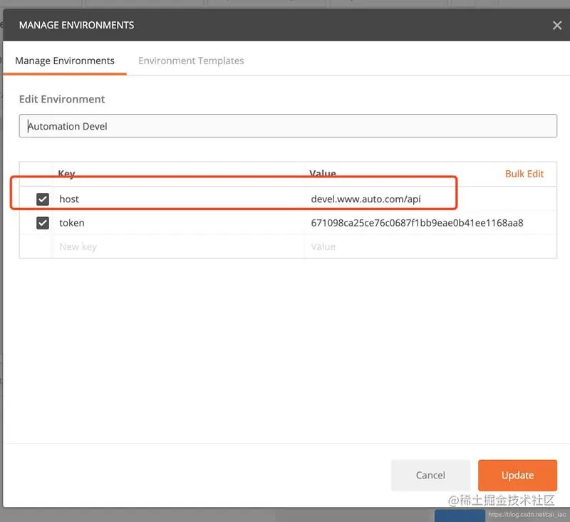 环境“参数集” 中的参数使用方式和全局变量一致,如图中 {{host}} ,不同环境的切换见下图:\