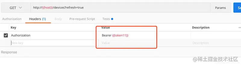 将 Request1 返回的 access_token 的值添加到环境变量"参数集"中。