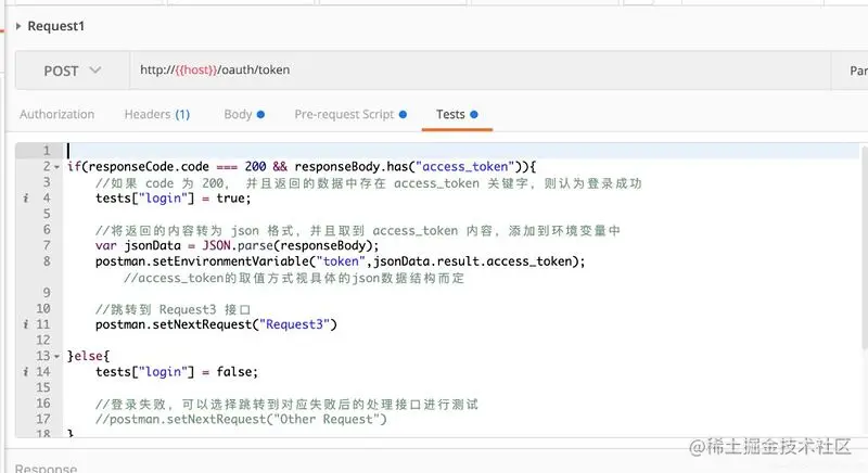 我们在运行完 Request1 接口成功后,不需要再运行 Request2 而是直接跳至 Request3 ,那么我可以在 Request1 接口的 Tests 功能区中执行跳转代码,如:\