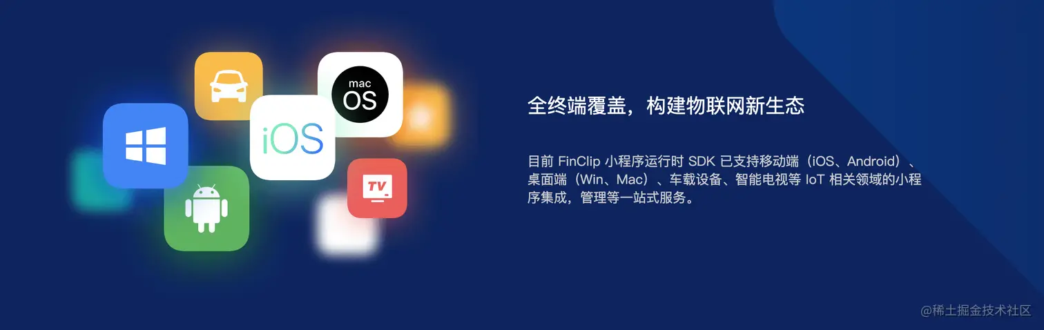 FinClip 支持手机以外的多种终端,包括 Linux、Windows、MacOS、麒麟等操作系统。这意味着,PC 端、车载设备、智能电视都能使用小程序了,实现了小程序的“一次开发,到处运行”,同时触达众多流量平台,而不仅仅局限于微信生态。