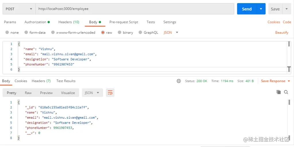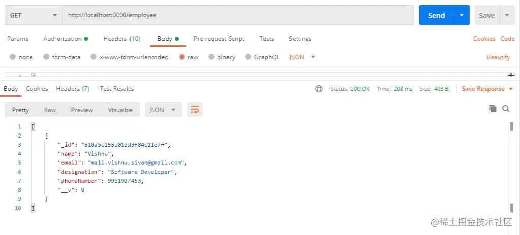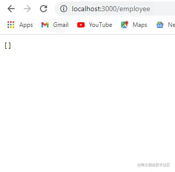 现在,让我们尝试通过postman访问api。如果你没有postman,只需尝试在浏览器中加载网址http://localhost:3000/employee。如果服务器正在运行,它将返回一个空数组[]。