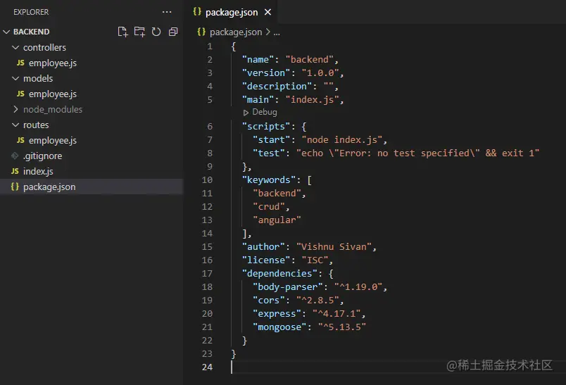 然后切换到项目文件夹(mean-stack-crud-app),打开visual studio代码编辑器或那里的任何代码编辑器。