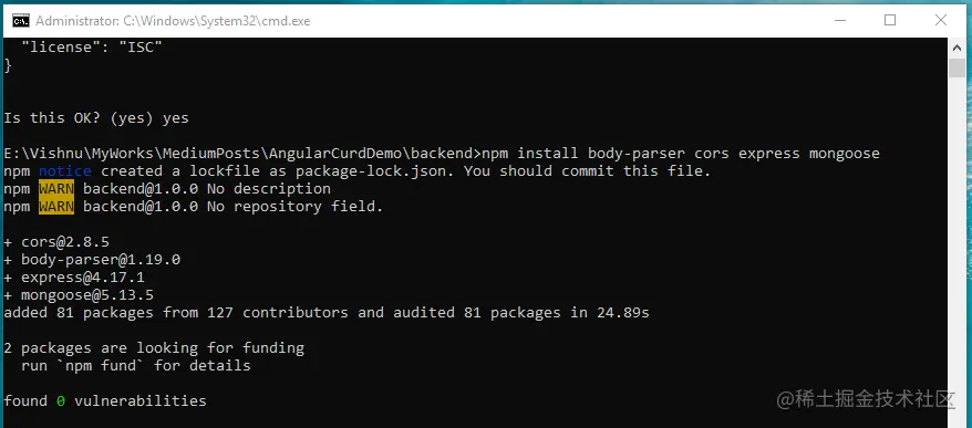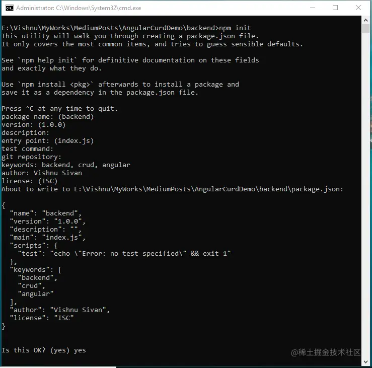 npm init 会提示你输入一些信息,如应用的名称、描述、版本、作者、关键词,也会问你看到的是否是你喜欢的。输入 "是",然后按回车键,就完成了package.json的创建。