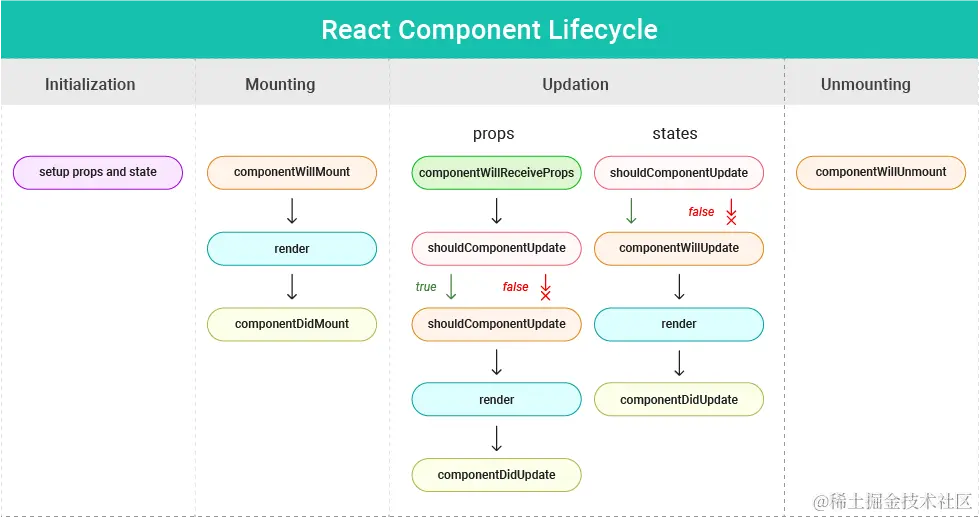 **shouldComponentUpdate()。**该方法告诉程序更新时渲染的状态。如果有新的道具或规则被更新,那么就可以进行渲染或跳过渲染。这对正确编码很重要,因为程序中也有不断变化的状态。将该方法更新为true/false是正确的做法。这里的默认值是true,可以根据代码来改变。