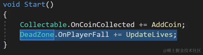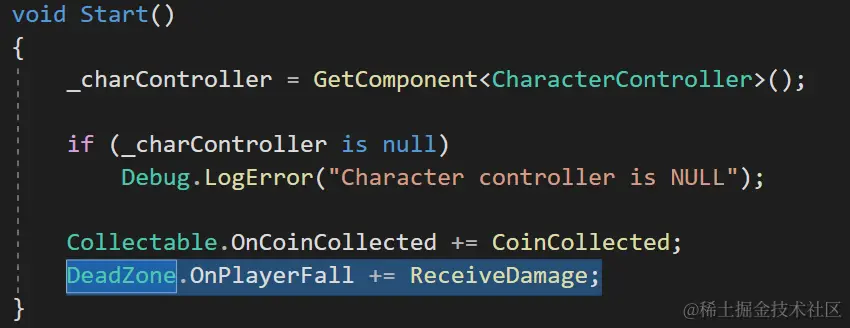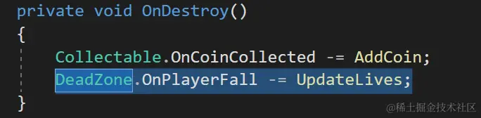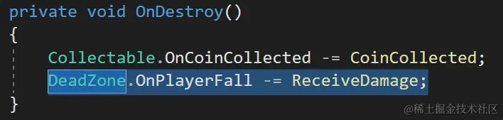 最后,让我们把这个方法添加到Start 方法的死区的Action Delegate中,这样,当玩家跌倒时,它就会被调用。另外,作为良好的做法,让我们使用OnDestroy 方法来删除它,以避免在玩家被摧毁时试图执行它。