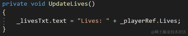 然后,让我们创建一个新的方法,通过改变文本属性和从播放器类调用生命属性来更新生命。