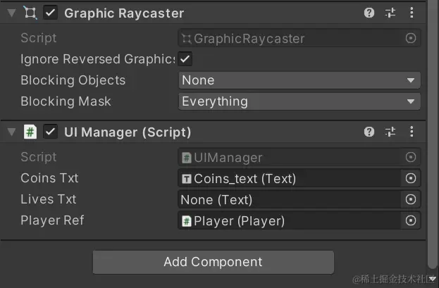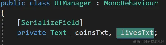 一旦我们有了文本元素,让我们打开UI管理器脚本并创建一个新的变量来存储对它的引用。