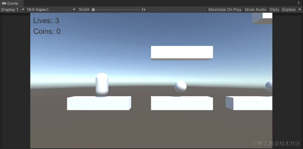 如果我们在Unity中运行游戏,我们会看到玩家每次跌倒都会重生并失去一条生命。