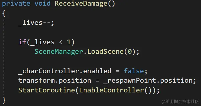 现在,为了处理生命系统,让我们打开玩家脚本并包含SceneManagement 命名空间,因为当玩家的生命耗尽时,我们将重新启动关卡。