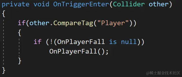 现在,让我们使用OnTriggerEnter 方法,以便能够触发与其他碰撞器的碰撞。在这个方法中,我们将通过比较其他碰撞器的标签来检查碰撞是否是与玩家发生的。如果该碰撞器属于玩家,我们将调用Action Delegate(如果它不是空的),在玩家下落时采取相应的行动。