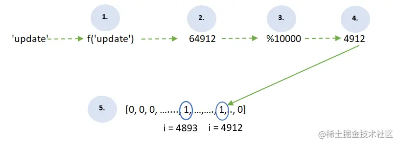 "update "与 "market "的哈希值相同,因此,得到相同的索引映射到数组中