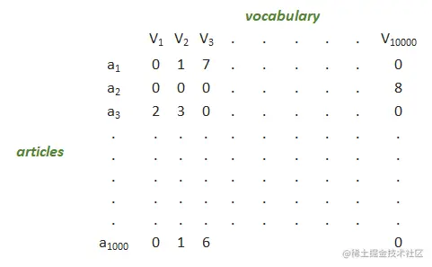 请注意,这里的大部分元素将是零,因为不是所有的文章都有所有的词汇。