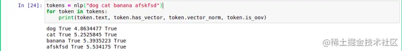 for token in tokens: print(token.text, token.has_vector, token.vector_norm, token.is_oov)