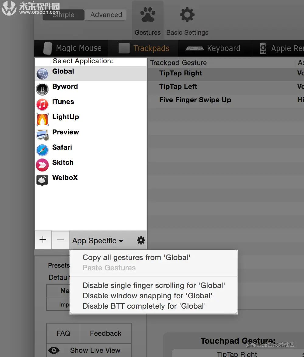 不同的设备对应不同的操作,比如上文提到的设备是 Trackpad 触控板,那么对应新建立的操作方式就是 Add New Gesture;若换成 Keyboard 键盘,那相关选项就会变为 Add New Shortcut,其余同理,大家自己尝试就知道了。这里比较特殊的就属 Leap Motion 体感控制器和 BTT Remote iOS 客户端了,使用前别忘了开启方框内的 Enable xxx support 功能,否则是无法连接成功的。