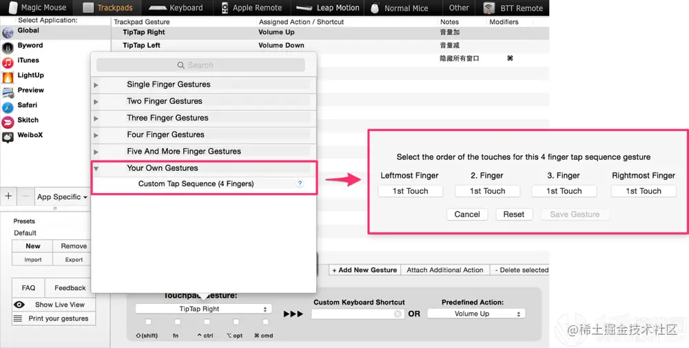 在这些触控板手势中,有个比较特殊的 Your Own Gestures 自定义手势选项,适用于创建内置手势外的动作。点击后会出现下图里右侧的窗口,但这里只提供了四个手指的支持,而且只能自定义先后点击的顺序,而不是行为,所以一般情况下不推荐使用该功能。