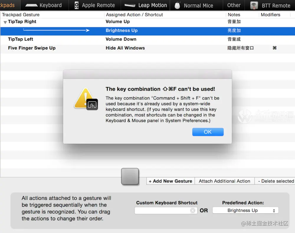 什么叫「绑定其他手势」?这个概念类似于「一键多用」,即一个新的操作方式可以代替两个甚至更多的默认操作方式,减少点击次数,增加使用效率。若 New Gesture 与重要的、无法修改的系统键冲突,BTT 会弹出警告框阻止你的行为。