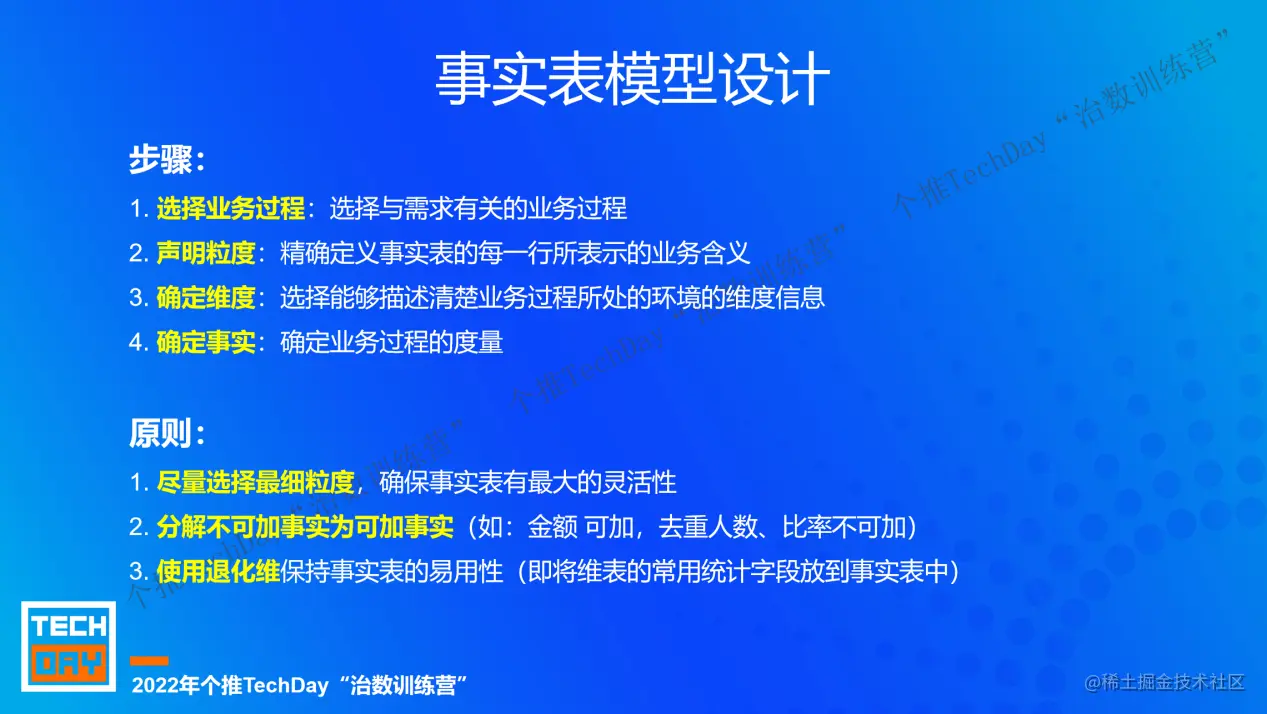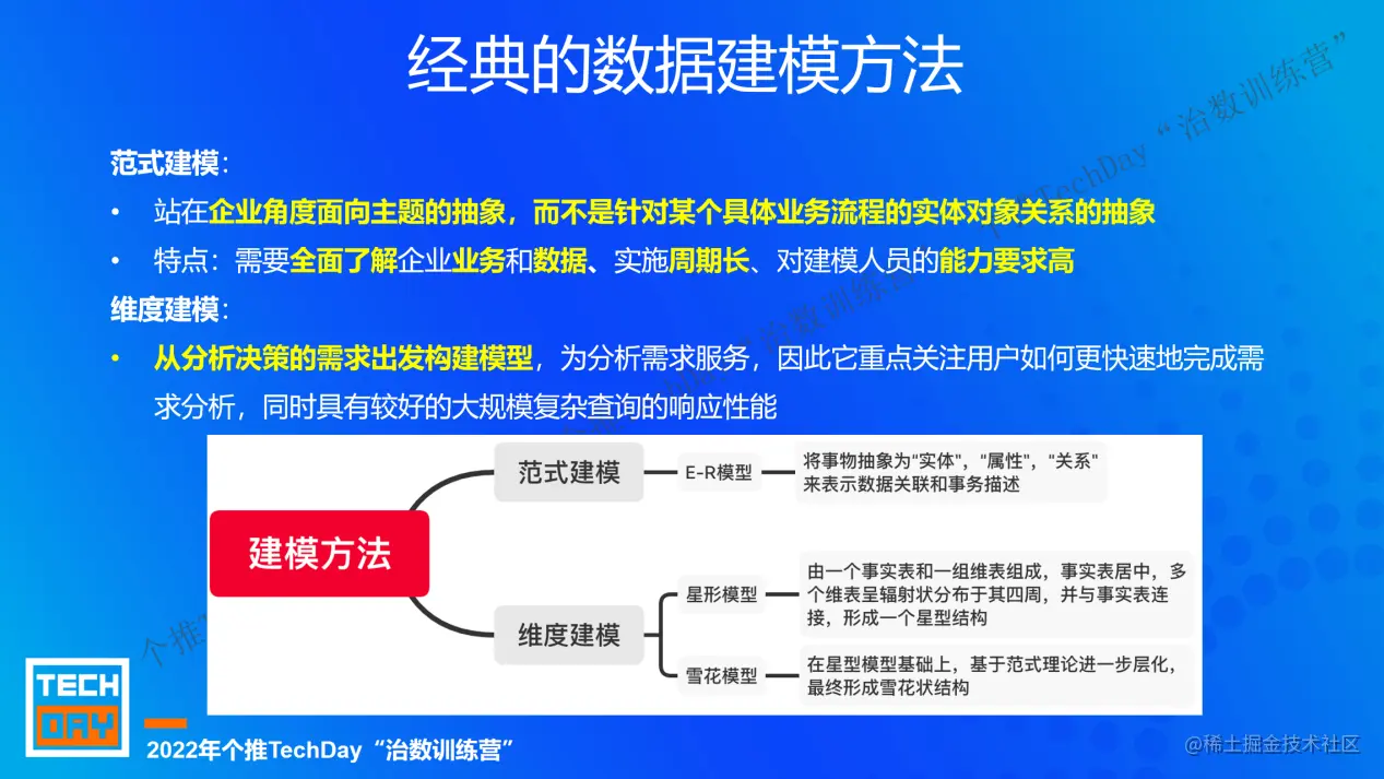 此外,本期个推TechDay“治数训练营”还对范式建模与维度建模的基本原则、建模中的常见问题(比如范式建模中的传递依赖问题、维度建模中的缓慢变化维问题等)、数仓分层等进行了详细阐述。